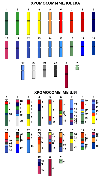 Рис. 37. Генетическое сходство (гомология) хромосом человека и мыши. Разными цветами и номерами на хромосомах мыши отмечены нуклеотидные последовательности человеческих хромосом, содержащие сходный сегмент.