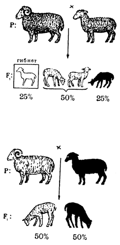 В крымском совхозе «Караул-базар» вел наблюдения генетик Я. Л. Глембоцкий. В этом совхозе в 1935 году от скрещивания серых баранов с серыми матками было получено 11235 ягнят, из которых 8424 были серыми, а 2811 — черными, то есть наблюдалось соотношение 3:1. В том же совхозе за год до этого были собраны данные о гибели оставленных на племя серых и черных ягнят, полученных от спаривания серых с серыми. Из 4728 серых ягнят за год пало 1613, то есть 33,6 процента. Среди черных падеж был невелик. За год из 1960 черных ягнят погибло всего 44, что составляет лишь 2,2 процента. Сопоставив эти цифры, Глембоцкий пришел к выводу, что все серые взрослые овцы — гетерозиготы, иначе они не давали бы в потомстве 3/4 серых и ? черных. Гомозиготы не доживают до взрослого состояния, о чем свидетельствует процент гибели среди серых, полученных от разведения «в себе», то есть скрещивания серых с серыми.