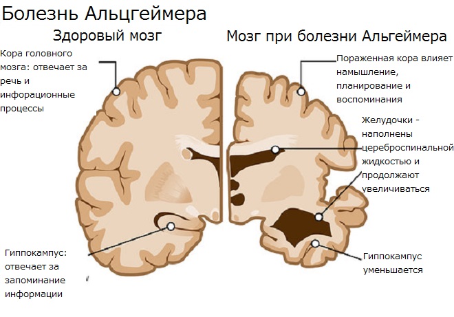 Поперечное сечение здорового мозга и мозга с продвинутой стадией болезни Альцгеймера.