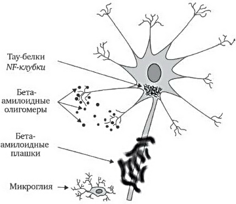 Стареющие клетки микроглии все менее эффективно поддерживают работу нейронов, особенно в плане того, что касается производства и обновления ?-амилоидов. Микроглиальные клетки «активируются» и изменяют и свою форму, и функцию: они вызывают все более сильное воспаление, что лишь увеличивает повреждения. Микроглия и нейроны начинают производить короткие, поврежденные ?-амилоидные молекулы – олигомеры, – которые ядовиты для нейронов. Чем сильнее повреждения, тем больше накапливаются ?-амилоидные бляшки. Когда нейроны повреждаются слишком сильно, их ?-белки, жизненно необходимые для поддержки аксонов и, соответственно, переноса сигналов от одного нейрона к другому, начинают накапливаться в теле нейронов. В конце концов нейроны уже не могут справиться с повреждением от воспаления, отказа микроглиальных клеток, ядовитых ?-амилоидов и ?-белковых клубков и умирают.
