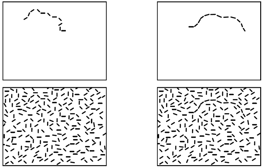Два объекта, изображенные на рисунке внизу, очень похожи. Разумеется, их легко распознать. Но когда они погружены в хаос пунктирных линий происходит нечто необычное. Зрительная система мозга работает двумя совершенно разными способами. Мы прекрасно видим объект, расположенный справа; он как будто другого цвета и бросается в глаза. С левым объектом происходит нечто иное. Мы лишь при большом усилии можем различить линии, образующие «змейку», и наше восприятие нестабильно: когда мы фокусируем внимание на одной части, другая пропадает и сливается с фоном.