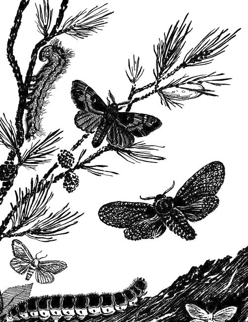 На рисунке: вверху — сосновка, сибирский коконопряд с гусеницей и коконом нише — древоточец пахучий с гусеницей; внизу — волнянки ивовые.