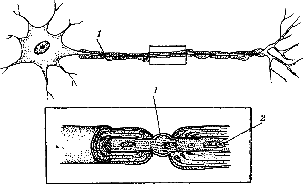Аксон, покрытый миелиновой оболочкой: 1 — перехват Ранвье; 2 — митохондрии