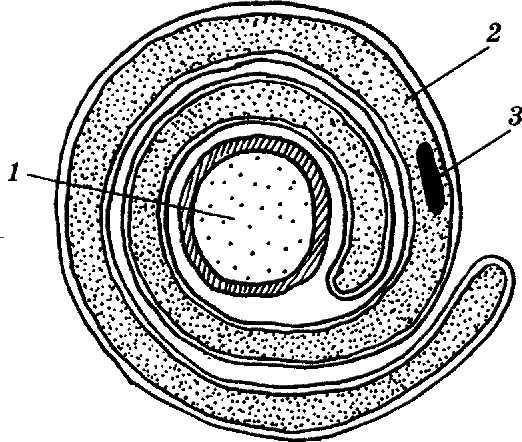 Схема строения изолированного нервного волокна: 1 — аксон; 2 — шванновская клетка; 3 — ядро шванновской клетки