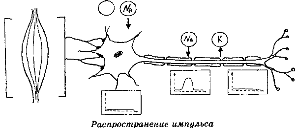 При этом, естественно, происходит перезарядка оболочки волокна: оно внутри заряжается положительно, а снаружи — отрицательно. Такое изменение зарядов само по себе становится раздражителем для соседнего участка нервного волокна. В результате на соседнем участке тоже открываются белковые каналы, ионы натрия устремляются внутрь — и так возбуждение мембраны распространяется по всей нервной клетке. Распространение возбуждения по нервной клетке и называется нервным импульсом.