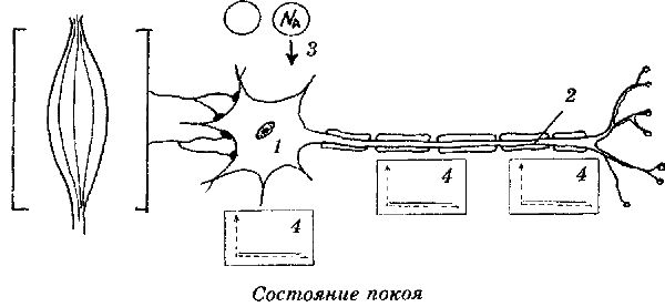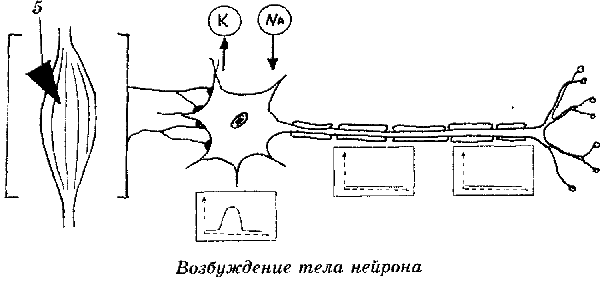 Возбуждение нервного волокна, вызванное каким — либо раздражителем, выражается в том, что в мембране нервной клетки открываются особые белковые каналы и положительно заряженные ионы натрия лавинообразно устремляются внутрь волокна.
