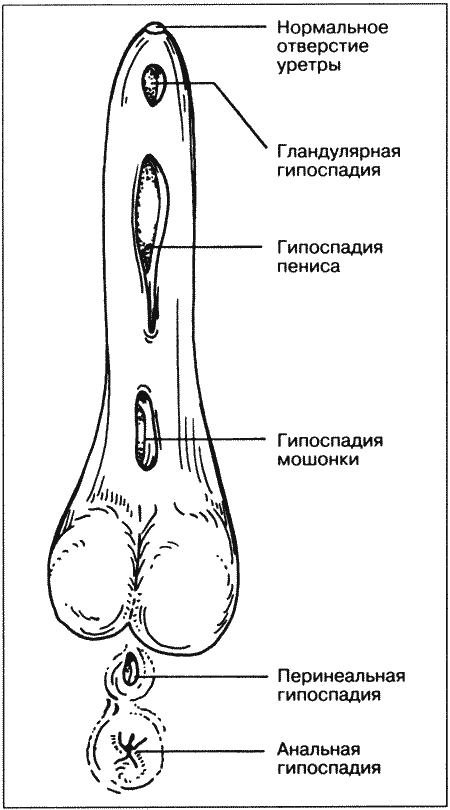 Это наиболее распространенная патология полового тракта самца; она заключается в неполном сращении урогенитальных складок, приводящем к нарушению формирования дистальной части уретры. Наружное отверстие уретры может располагаться на любом участке с вентральной стороны пениса вплоть до перинеальной области. Различают гландулярную гипоспадию, гипоспадию пениса, мошонки, перинеальную и анальную в зависимости от места выхода уретры (фиг. 15.7). Как правило, гипоспадия наблюдается на фоне других отклонений (незаращения препуция или недоразвития пениса). Диагноз устанавливают на основании осмотра пениса и перинеальной области. Хирургическая коррекция не всегда возможна, поскольку краниальная от отверстия часть мочеиспускательного канала может быть недостаточна для его удлинения. При тяжелых дефектах пениса проводят скротальную уретростомию, однако в большинстве случаев гипоспадия не требует вмешательства.