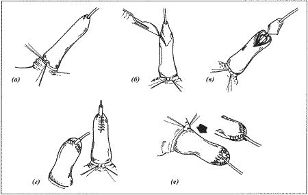 Частичная ампутация пениса: а) уретру катетеризируют, пенис перетягивают жгутом, одновременно удерживающим препуций; б) делают V-образный разрез глубиной до дорсальной поверхности кости полового члена, следя за тем, чтобы не перерезать уретру, расположенную с вентральной стороны; в) ампутируемый участок пениса удаляют по катетеру; г) на разрез накладывают простой узловой шов; д) уретру подшивают поверх культи пениса