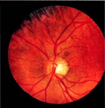 Рис. 18. Офтальмолог, рассматривая глазное дно, видит нечто сходное с этим фотоснимком нормальной сетчатки. Сосок зрительного нерва расположен слева; здесь в сетчатку входят артерии и из нее выходят (более темные) вены. Темно-красная зона у самого края справа — макула; в центре этой области располагается центральная ямка, на снимке не показанная. Темная зона вверху слева — нормальная меланиновая пигментация.