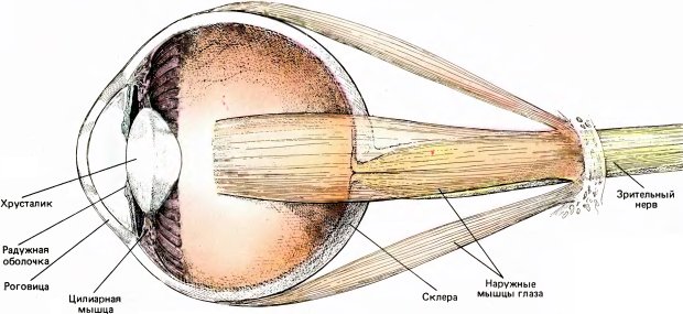 Рис. 19. Глазное яблоко и мышцы, контролирующие его положение. Роговица и хрусталик фокусируют световые лучи на заднюю стенку глаза. Хрусталик регулирует фокусировку близких и удаленных объектов — его выпуклость соответственно увеличивается и уменьшается.