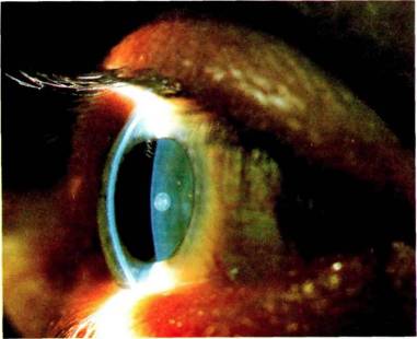 Рис. 20. Свет входит в глаз через прозрачную роговицу, которая вносит наибольший вклад в преломление световых лучей. Белое пятно на зрачке — отражение света.