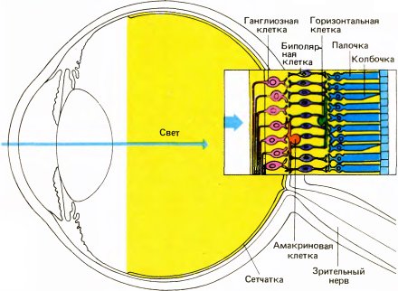 Рис. 21. В увеличенном фрагменте сетчатки справа показано относительное расположение трех ее слоев. Это покажется удивительным, но прежде чем свет достигнет палочек и колбочек, он должен пройти через слои ганглиозных и биполярных клеток.
