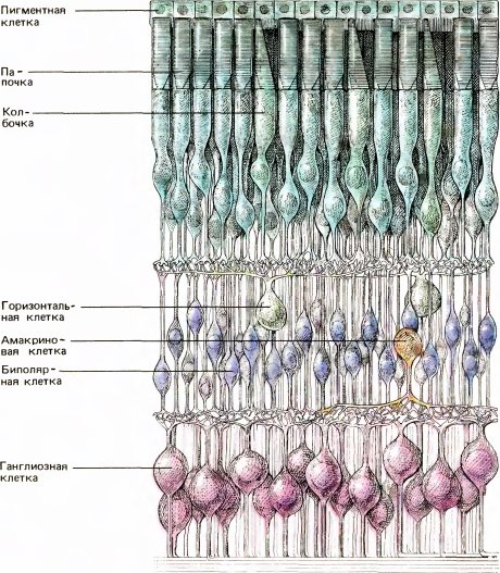 Сетчатка — это часть мозга, отделившаяся от него на ранних стадиях развития, но все еще связанная с ним посредством пучка волокон — зрительного нерва. Подобно многим другим структурам центральной нервной системы, сетчатка имеет форму пластинки, в данном случае толщиной приблизительно в четверть миллиметра. Она состоит из трех слоев тел нервных клеток, разделенных двумя слоями синапсов, образованных аксонами и дендритами этих клеток.