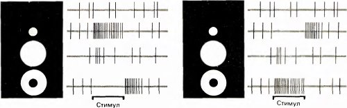 Прямо противоположным было поведение клетки с off-центром. Ее рецептивное поле состояло из маленького центра, с которого получалась off-реакция, и периферии, дававшей on-реакцию. Клетки обоих типов были перемешаны и встречались примерно одинаково часто. Клетки с off-центром разряжаются с наибольшей частотой в ответ на черное пятно на белом фоне, поскольку при этом освещается только периферия ее рецептивного поля. В природе темные объекты, по-видимому, столь же распространены, что и светлые; этим можно объяснить, почему информация от сетчатки передается клетками как с on-центром, так и с off-центром.