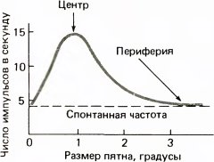 Рис. 26. Если стимулировать одиночную ганглиозную клетку с on-центром все более крупными световыми пятнами, реакция будет постепенно усиливаться вплоть до пятна с величиной около 1 градуса. Это совпадает с величиной центра. Дальнейшее увеличение пятна ведет к уменьшению реакции, так как при этом пятно начинает захватывать антагонистическую периферию. При размерах пятна более 3 градусов реакция перестает уменьшаться, поэтому 3 градуса — это поперечник всего рецептивного поля, включая центр и периферию.