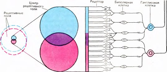 Рассмотрев упрощенную схему на рис. 28, легко понять, чем это обусловлено: ганглиозные клетки, окрашенные красным и голубым, имеют входы от перекрывающихся областей, соответственно окрашенных на поперечном сечении. Вследствие дивергенции, при которой на каждом уровне одна клетка образует синапсы со многими другими клетками, один рецептор может оказывать влияние на сотни или тысячи ганглиозных клеток. Он будет находиться в центрах рецептивных полей одних клеток и на периферии полей других клеток. Этот рецептор будет возбуждать некоторые нейроны через их центры, если это клетки с on-центром, или через их периферию, если это клетки с off-центром; и он будет одновременно тормозить другие нейроны через их центры или периферию. Таким образом, маленькое световое пятнышко, появившееся на сетчатке, может вызвать разнообразную активность многих клеток.