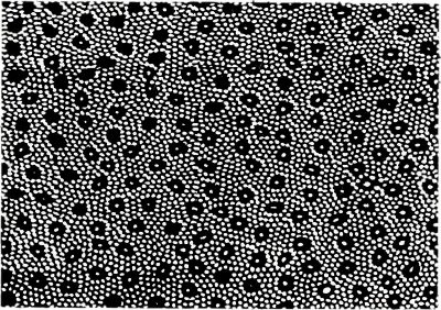 Рис. 30. Этот срез периферической части сетчатки обезьяны проходит через слой палочек и колбочек. Маленькие белые пятнышки — палочки; более крупные черные участки с белыми точками в центре — колбочки.
