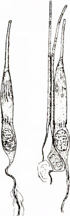 Рис. 31. Одиночная колбочка (слева) и две палочки с колбочкой (справа) были отпрепарированы и окрашены осмиевой кислотой. Тонкий отросток наверху каждой клетки — наружный сегмент, содержащий зрительный пигмент. Волокна внизу идут к не показанным здесь синаптическим областям.