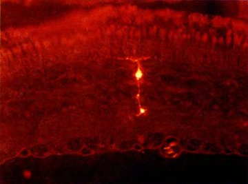 Рис. 32. Зарегистрировать реакцию клетки в нервной системе — это одна проблема; другая заключается в том, чтобы, сделав такую запись, точно знать, от клетки какого типа она получена. На этой микрофотографии показана одиночная биполярная клетка в сетчатке золотой рыбки, зарегистрированная в 1971 году Акимити Канеко, который тогда работал в Гарвардской медицинской школе. То, что это именно биполярная, а не амакриновая или горизонтальная клетка, было доказано инъекцией через микроэлектрод флуоресцентного красителя проционового желтого. Краситель распространяется по всей клетке, выявляя ее форму. На этом поперечном срезе рецепторы расположены сверху.