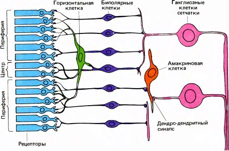 Своеобразны и синапсы, образуемые горизонтальными клетками с рецепторами: у них отсутствуют электронно-микроскопические признаки, обычно указывающие, в каком направлении передаются сигналы. Ясно, что рецепторы доставляют информацию горизонтальным клеткам через возбуждающие синапсы, поскольку в большинстве случаев горизонтальные клетки, подобно рецепторам, гиперполяризуются (т.е. выключаются) светом. Менее ясно, куда эти клетки посылают свои выходные сигналы. Известно, что у некоторых животных, например у черепах, они передают информацию обратно рецепторам; у других видов они образуют синапсы с дендритами биполярных клеток и, несомненно, передают им информацию; о приматах мы не располагаем какими-либо сведениями. Итак, горизонтальные клетки получают входные сигналы от рецепторов; их выход пока точно не известен, но он направлен либо к рецепторам, либо к биполярным клеткам, либо к тем и другим.