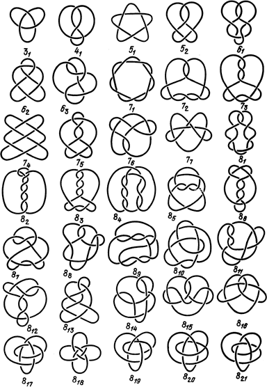 Тэйт имел склонность к абстрактным математическим построениям. Он стал думать: какие еще бывают узлы? Но вскоре совсем забыл о частицах (будто знал, что с ними и через полтораста лет не разберутся) и стал просиживать долгие часы с веревкой, завязывая всевозможные узлы. Тэйт составил первую таблицу узлов. В ней он последовательно разместил те узлы, которые смог придумать. В дальнейшем была проведена полная «инвентаризация» всех узлов, имеющих менее десяти пересечений на их проекциях. Таких узлов набралось 84. Часть из них изображена на рис. 35.
