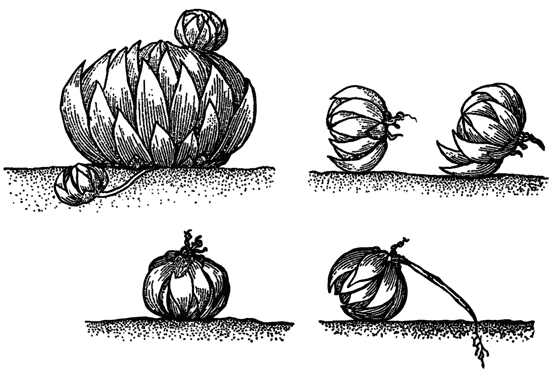 Если вы приглядывались к растительности песчаных склонов и сосновых боров, вы, наверное, замечали оригинальные зеленые «розетки», встречающиеся иногда целыми стаями. Это Sempervivum soboliferum, т. е. живучка побегоносная, которую в народе называют почему-то «молодилом». Цветущие живучки, по крайней мере в наших местах, — большая редкость, мне лично ни разу в жизни не встретившаяся. Но живучке цветы и не нужны: она отлично распространяется побегами, на которых вырастают молодые розеточки. Часто эти «детки» вырастают рядом со своей «матерью», но иногда побег проходит между листьями так, что «детка» оказывается сидящей на материнской розетке. Достаточно выросши, она сваливается на землю. Иногда это получается от какого-нибудь случайного толчка: либо капля дождя, либо удар ноги прохожего, либо упавшая с сосны шишка и т. п. заставляет молодую розетку оторваться от матери. Упав на землю, розетка, разумеется, далеко не всегда оказывается в надлежащем положении — донцем к земле; она может лечь и на бок, а то и совсем донцем вверх. Тут-то она и начинает действовать, подобно жуку, хотя и несравненно медлительней. Если розеточка легла боком, ее нижние листья оказываются затененными и вследствие этого начинают усиленно расти. Эти листья, действуя подобно надкрыльям жука, поворачивают розеточку в нормальное положение.