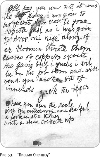 Прежде всего, исследовали так называемое письмо Опеншоу. Эту хвастливую записку получил 29 октября 1888 г. доктор Томас Опеншоу[61], хирург, который осматривал половину человеческой почки, незадолго до того присланную Джорджу Ласку, председателю уайтчепельской организации добровольцев, патрулировавшей улицы после первых убийств. Наглости у убийцы хватало, письма официальным лицам он посылал регулярно, хотя относительно некоторых позднее выяснилось, что писали их журналисты, подогревающие интерес к кровавому расследованию.