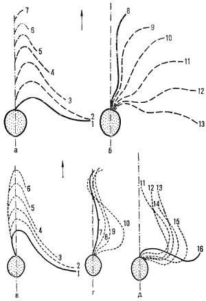 Фото 37. Движения жгутиков одноклеточного растительного организма из рода Monas удивительно точно соответствуют господствующим условиям обтекания. Поэтому к.п.д. подобного весьма гибкого механизма движения приближается к 100 процентам. В технике добиться такого показателя практически невозможно. На схеме а и б — два вида возвращения жгутика в исходное положение;в, г и д — различные виды направляющего движения жгутика.