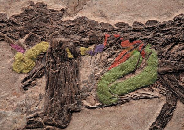 На поразительно хорошо сохранившемся кишечнике крошечного теропода сципионикса видны петли, как наверняка было в жизни. Можно увидеть маленькие складки на стенках кишечника и микроскопические анатомические детали
