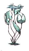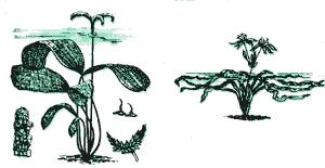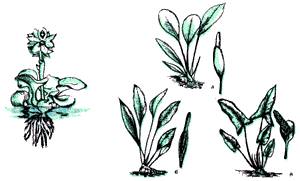 б) форма листьев и окраска те же, но молодые листья у поверхности коричневатые, плавающих обсыхающих листьев не дает, на цветоножке стрелковидный конус, из которого разворачиваются листья молодого растения, корневище на цветоножке не образуется;