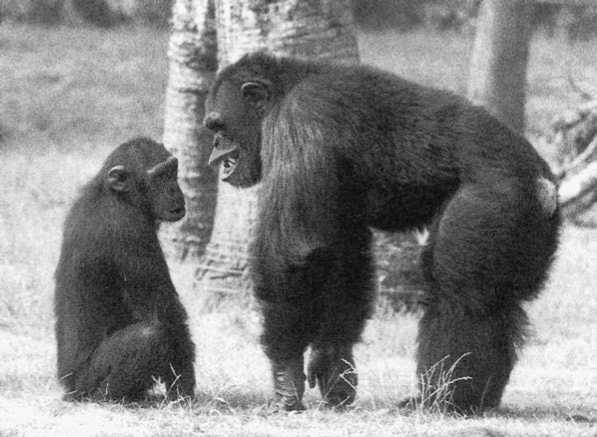 Я так часто видел, что «приветствие» прокладывает путь к примирению с доминирующим членом группы, который исходно не настроен на него, что теперь совершенно уверен в том, что для того, кто ищет контакта, это действительно ситуация в стиле «поклонись или пропадешь». (Если эта интерпретация и может показаться натянутой, то в основном потому, что мы, люди, склонны полагать, будто такое поведение требует холодного и расчетливого мышления, однако я не уверен, что это всегда так. Интеллект и социальная осведомленность, необходимые для осуществления эмоционального давления на других, могут быть подсознательными. В конце концов, дети в семье порой становятся настоящими диктаторами уже в самом раннем возрасте, но рационально они не сознают, что делают.)