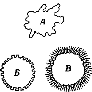 А. Капля прованского масла в растворе соды походит на амебу. Б. Капля миндального масла в растворе соды походит на некоторых одноклеточных животных. В. Капля креозота в соде походит на солнечника (увеличено).