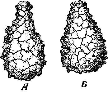 А — Ракушка настоящей дифлюгии. Б — капля масла в спирту с прилипшими к ней песчинками (сильно увеличено).