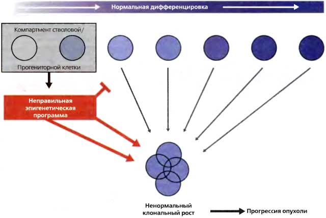 Самые ранние этапы опухолеобразования описываются как аномальная клональная экспансия, которая разворачивается при стрессовом воздействии на клеточное обновление. Она вызывается такими факторами, как старение и хронические нарушения, связанные, например, с воспалением. Это как раз те клеточные клоны, в которых могут произойти последующие генетические и эпигенетические события, направляющие развитие опухоли. Такие аномальные эпигенетические события, как аберрантный генный сайленсинг, о котором говорится в данной главе, могли бы быть во многих случаях наиболее ранними наследуемыми причинами, вызывающими аномальную клональную экспансию из компартментов стволовых (или прогениторных) клеток в обновляющейся системе клеток взрослого организма. Сайленсинг генов включается модификациями хроматина, которые репрессируют транскрипцию, а гиперметилирование ДНК этого хроматина служит «надежным запором», чтобы стабилизировать наследуемый сай ленсинг, как сказано в тексте главы. Генный сайленсинг, в свою очередь, нарушает нормальный гомеостаз, удерживая стволовые клетки и прогениторные клетки от того, чтобы должным образом двигаться по пути дифференцировки, существующей в данной системе эпителиальных клеток (верхние клетки все более темного синего цвета) и направляя их (большие красные стрелки) к аномальной клональной экспансии