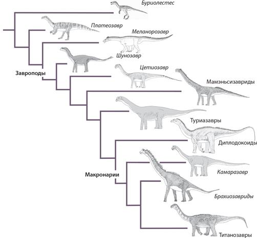 На этой упрощенной кладограмме видно, что ранние завроподы были двуногими, причем гораздо меньшими по размеру, чем их исполинские потомки. Большинство видов относится к продвинутым линиям диплодокоидов и макронариев