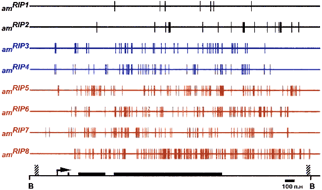 Рис. 6.12. Мутации от RIP и статус метилирования восьми аллелей am