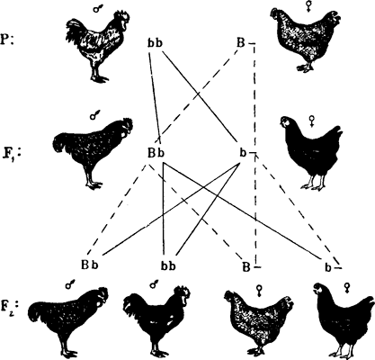 В птицеводстве ценят гибриды первого поколения от скрещивания красного род-айленда с полосатым плимутроком. Их ген полосатости, сцепленный с полом, позволяет в однодневном возрасте отличать петушков от курочек. Рассмотрим это скрещивание.