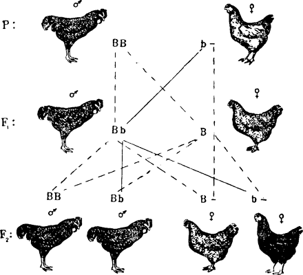 В сельскохозяйственной практике ограничиваются именно этим скрещиванием и никогда не доводят его до второго поколения. Но генетики получали и F2. В этом случае оказывалось поровну кукушкоперых и красноперых петухов, кукушкоперых и красноперых кур (см. рис.).