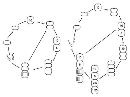 Перейти от достигнутого нашим Metazoon высокоразвитого состояния к одному фиксированному жизненному циклу очень просто. Для этого не надо создавать ничего нового, напротив, нужно упростить систему. Это называют «генокопированием модификаций». В результате «генокопирования» один из вариантов развития будет жестко закреплен в геноме. Он начнет реализовываться всегда, вне зависимости от условий. Представим себе, что условия У2 (хищника нет) перестали возникать, среда стала более стабильной: всегда существуют только условия У1 (хищник есть). Четырехклеточный вариант жизненного цикла становится ненужным. Регуляторный контур, обеспечивающий отключение ускорения митоза передней клетки в отсутствие хищника, больше не задействуется и просто отмирает под грузом случайных мутаций. Мы вернулись к тому же состоянию, которое существовало после первого этапа нашего мысленного эксперимента (когда первая регуляторная связь уже сформировалась, а вторая — еще нет).