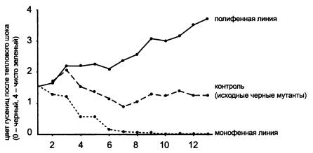 Цвет гусениц после теплового шока в ходе отбора становился все более зеленым в полифенной линии и все более черным — в монофенной.