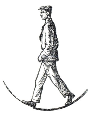 Однако для процесса ходьбы характерна одна важная особенность. Она заключается в том, что при каждом шаге нога отталкивается от земли в точке, находящейся несколько позади центра тяжести тела. В результате человек падает вперед до тех пор, пока он не выставит вперед другую ногу. Эта особенность и натолкнула Юлиуса Макерле на мысль создать так называемое "шагающее колесо".