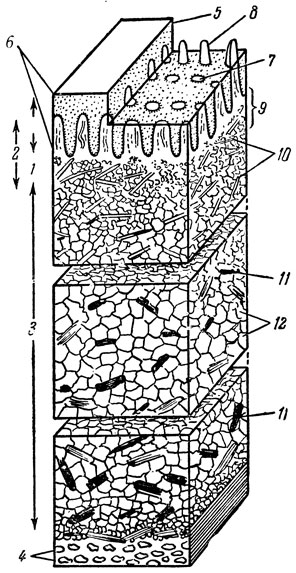 Рис. 10. Разрез дельфиньей кожи (схема). 1 — эпидермис; 2 — дерма; 3 — жировой пласт; 4 — подкожная мускулатура; 5 — верхний роговой слой эпидермиса; 6 — ростковый слой эпидермиса; 7 — ячейки росткового слоя; 8 — шиловидные сосочки дермы; 9 — подсосочковый слой дермы; 10 — пучки коллагеновых волокон; 11 — пучки эластиновых волокон; 12 — жировые клетки (по В. А. Соколову)