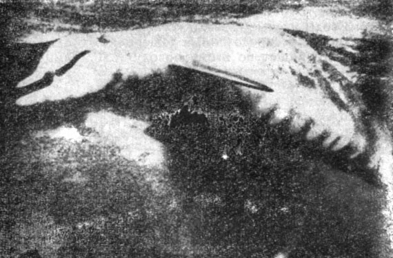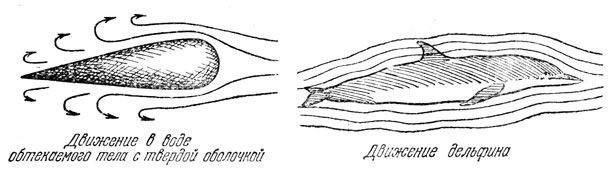 Рис. 12. В момент достижения дельфином критической скорости его кожа собирается в складки, которые сбивают вихревые потоки, возникающие вокруг движущегося тела (по А. Г. Томилину)