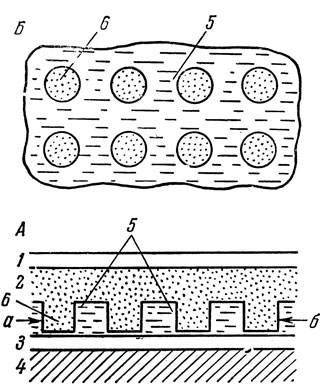 Рис. 13. Схема искусственной дельфиньей кожи — 'ламинфло'. А — боковой разрез, Б — разрез по линии аб. 1 — верхняя бесшовная оболочка; 2 — средний слой — эластичная диафрагма с гибкими стерженьками; 3 — нижняя бесшовная оболочка; 4 — корпус модели; 5 — пространство между стерженьками, заполненное демпфирующей жидкостью; 6 — гибкие стерженьки среднего слоя (по М. Крамеру)
