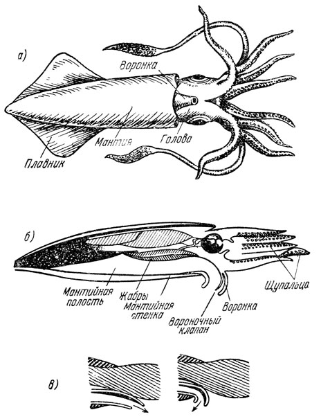 Рис. 14. Кальмар и его реактивный движитель, а) Кальмар — живая ракета; б) пульсирующий реактивный движитель кальмара; в) положение сопла и его клапана при движении кальмара назад (слева) и вперед (справа)