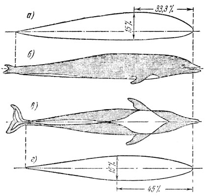 Рис. 15. Быстроходный дельфин хорошо обтекаемой формы и близкие по контурам аэродинамические профили (по С. В. Першину). а) Несимметричный 15%-ный профиль ЦАГИ серии В; 6) и в) вид дельфина сбоку и снизу (экземпляр длиной 2,08 м, весом 56 кг); г) симметричный 15%-ный ламинаризованный профиль НАКА