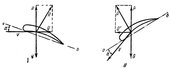 Откуда же возникает сила тяги? При взмахе крыла вниз составляющие силы распределяются несколько по-иному, чем в только что разобранном случае. Сила Р по-прежнему направлена вверх и уравновешивает силу тяжести, а перпендикулярная ей сила Q' направлена вперед и создает тягу. Разложение сил при всевозможных положениях крыла показывает, что сила тяги может возникать и при поднимании крыла (рис. 16, II). Определяющим моментом в этом случае служит знак так называемого угла атаки, т. е. угла между хордой крыла и направлением набегающего на него воздушного потока.