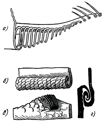 Здесь невольно сама собой напрашивается аналогия: подобно тому как творцы самолетов заменили старые, тихоходные "этажерки" — бипланы и трипланы — монопланами, природа помогла многим четырехкрылым насекомым усовершенствовать свой летательный аппарат, избавив или почти избавив его от лишней пары крыльев. У двукрылых — мух, слепней, комаров — задние крылья исчезли не бесследно, а превратились в жужжальца. Каждое жужжальце состоит из вздутого основания, тонкой ножки и вздутой головки и имеет вид булавы. Эти жалкие остатки задних крыльев не играют активной роли в полете, а лишь косвенно связаны с ним: они, говоря инженерным языком, выполняют функции стартера. Так как многие двукрылые взлетают на высоком ритме ударов крыльев, жужжальца способствуют "разгону" крыловых мышц. Постепенно ускоряя ритм своих движений, жужжальца вызывают соответствующие ритмические события в тех частях нервной системы насекомого, которые управляют крыловой мускулатурой. Когда достигается нужный ритм, включается собственно двигательный аппарат — "мотор крыла" сразу начинает работать полным ходом, что и требуется для взлета. У перепончатокрылых же переднее и заднее крылья сцеплены друг с другом, образуя механическое целое без всяких, однако, сращений. Переднее крыло пчелы, например, имеет на заднем краю складку — "карман". В него входят загнутые крючки переднего края заднего крыла, и последнее оказывается как бы на буксире у переднего и работает в унисон с ним (рис. 17, а). Почти так же устроен сцепочный механизм у тлей (рис. 17, 6, в, г), с той лишь разницей, что крючков здесь немного и они тесно сближены. Бабочки имеют иные сцепочные механизмы — толстые щетинки на нижней стороне заднего крыла входят в складку на переднем крыле. У многих высших форм этих приспособлений нет и крылья связываются посредством широкого наложения переднего на заднее. Но важен не способ соединения, а результат: у всех перепончатокрылых переднее и заднее крылья каждой стороны крепко скреплены и работают как одно целое. Таким образом, выражение "четырехкрылые" не следует понимать буквально. Морфологически четырехкрылое построение является функционально двукрылым.