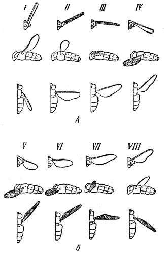 Рис. 17. Механизмы сцепления крыльев у пчел (а) и у тлей (6, в, г)