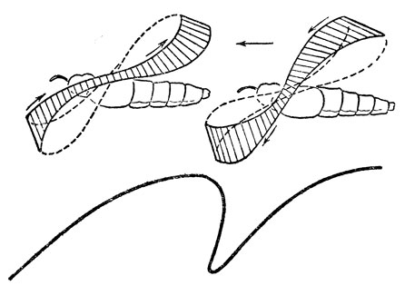 В полете крыло насекомого работает то верхней, то нижней поверхностью, поворачиваясь вокруг продольной оси насекомого. Когда крыло переходит из положения I в положение IV, оно бьет сверху вниз своей нижней поверхностью (положения II и III показывают это особенно ясно). Возникает подъемный эффект, в результате которого тело насекомого поднимается вверх. При переходе из положения IV в V крыло поворачивается вокруг продольной оси и, пройдя через вертикальное положение, переходит в наклонное — нижним краем вперед. После этого начинается обратное движение крыла, т. е. его подъем вверх, изображенный на схеме (Б). Нетрудно увидеть, что, переходя из положения VI в VII и VIII, крыло, словно весло, ударяет спереди назад. Вследствие этого тело насекомого получает толчок вперед. Дойдя до крайней верхней и задней точки, крыло снова поворачивается около своей продольной оси, затем принимает горизонтальное положение, и цикл повторяется вновь. Первую часть траектории крыла называют подъемной, или элеваторной, вторую — пропеллирующёй. За полный цикл вершина крыла описывает по отношению к телу насекомого восьмеркообразную кривую, наклоненную верхним концом назад, или лемнискату, которая при движении растягивается в кривую, напоминающую синусоиду (рис. 19). Благодаря большой частоте взмахов элеваторный эффект аэродинамически сливается с пропеллирующим, и насекомое движется вверх и вперед. Таким образом, согласно теории Марея — Бюлля — Маньяна, принцип работы крыла насекомого столь же прост, сколь и совершенен.